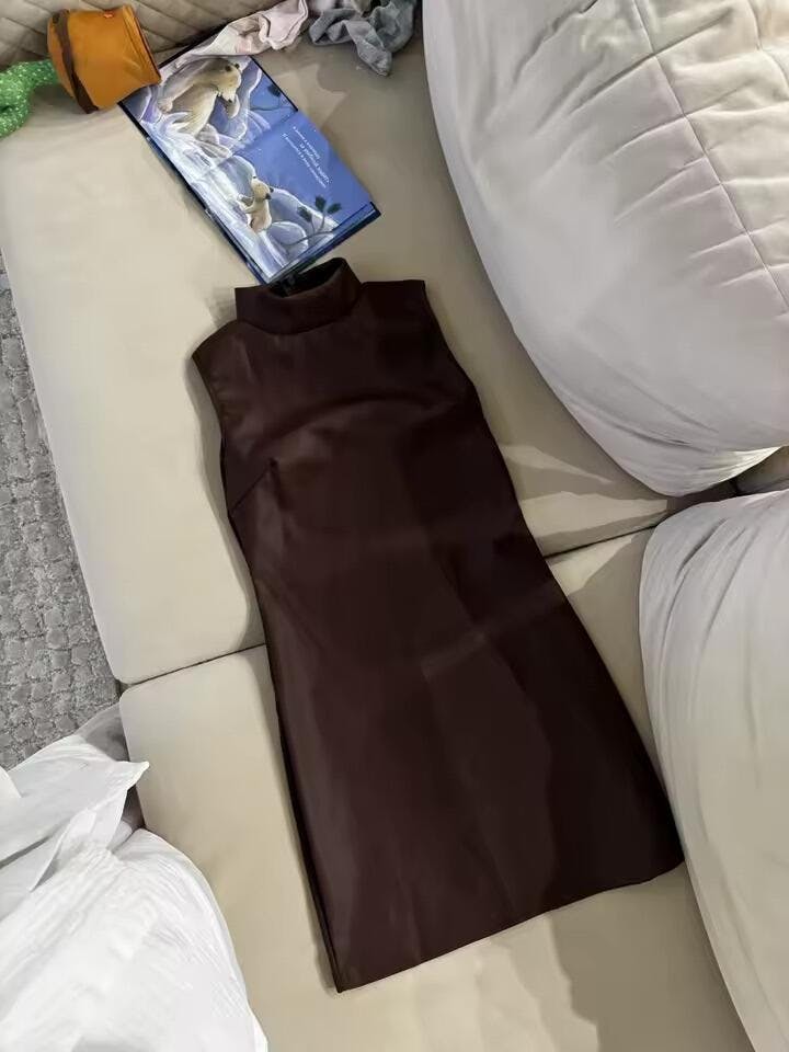 A refined sleeveless bodycon dress made from soft stretch faux leather. Available in two lengths and two classic colors. The fabric has a smooth finish, adapts to the body, and creates a clean, elegant silhouette.