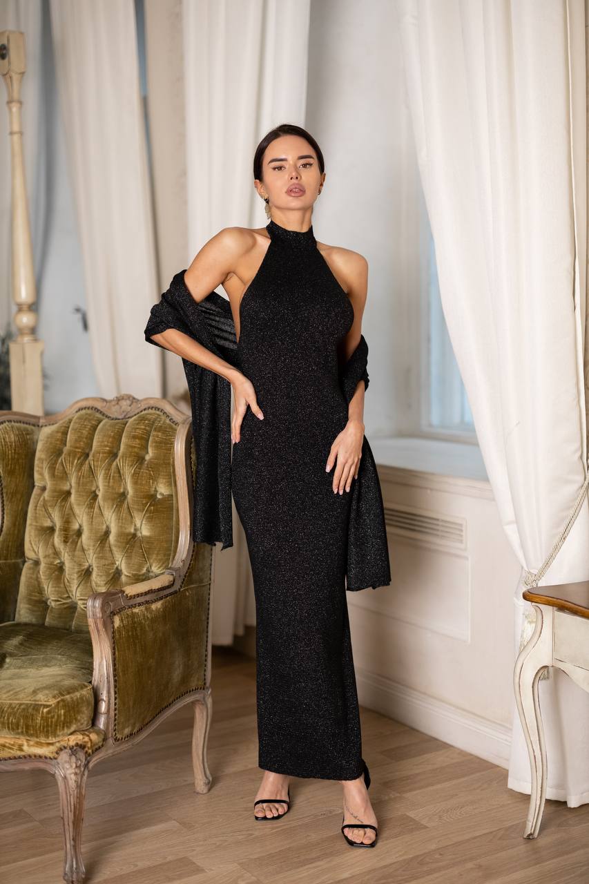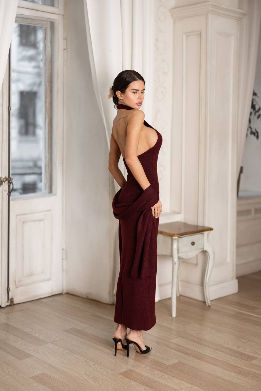 Halter Neck Knit Maxi Dress with Matching Shawl – Open Back Elegant Long Dress, Minimal Evening Outfit